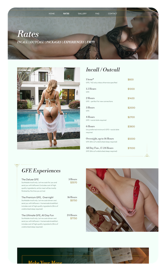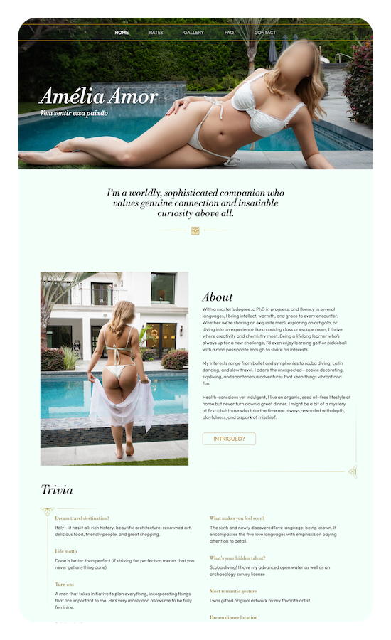 A custom multi page website is the best way for an independent escorts to elevate your brand and increase your earnings. All websites come with full tech and marketing support.